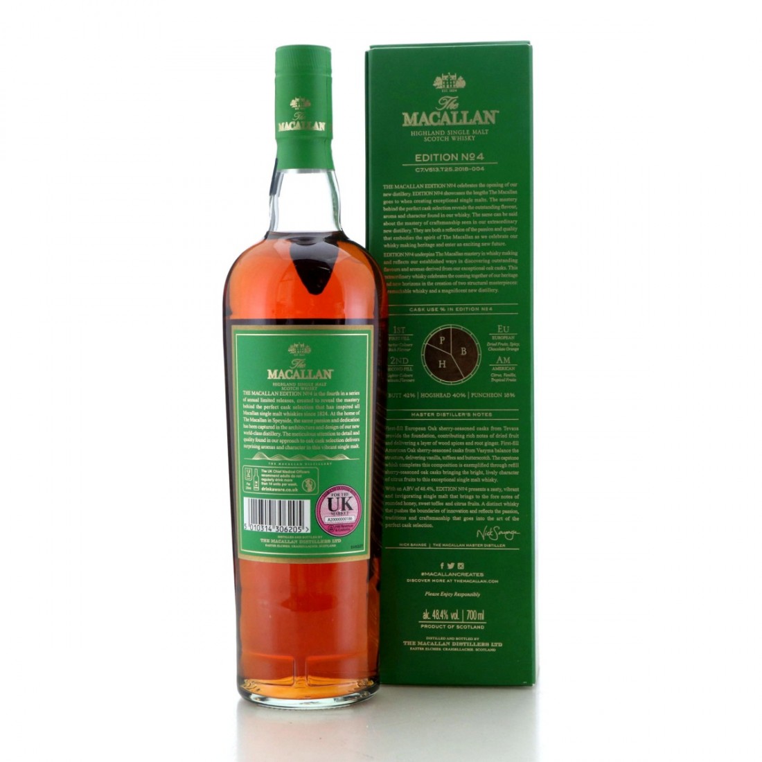 This is the 2018 and fourth annual bottling in the Edition series. Edition No.4 was intended to celebrate the design and craftsmanship involved in the new Macallan distillery which opened that year, and was packaged in green to evoke the turf covered roof of the spectacular new site.