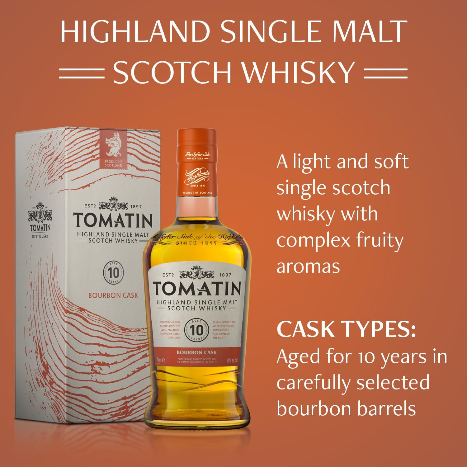 Distilled slowly in tall copper stills and matured for a decade in carefully selected bourbon barrels, it showcases the finesse for which Tomatin is known around the world